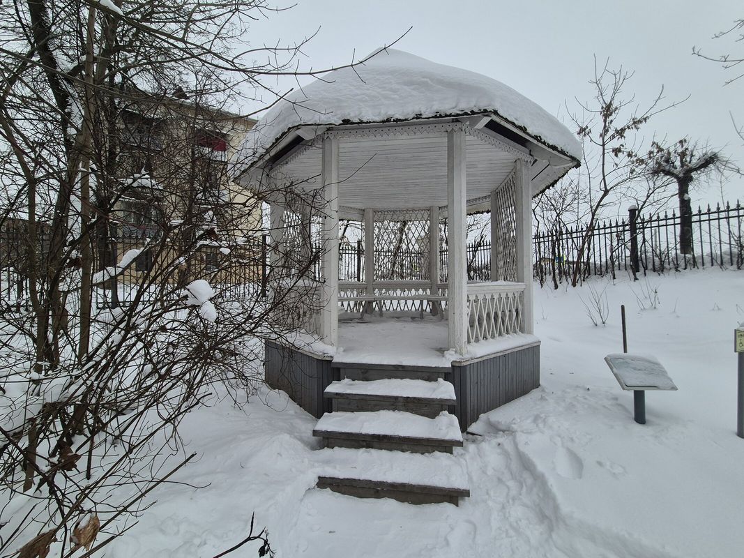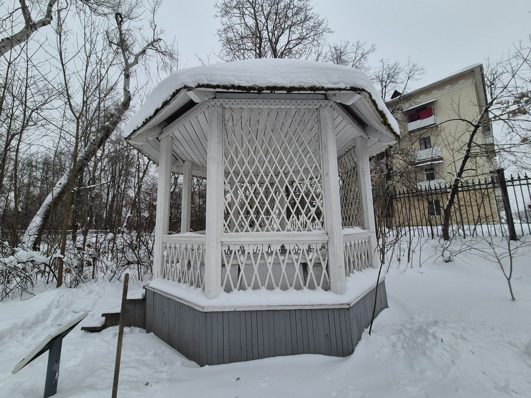 Деревянная беседка на фундаменте из кирпичных столбов была построена в 1938 году. Сооружение устроено на восьмиугольном в плане цоколе и образовано восьмью гранёными столбами, поддерживающими невысокий восьмигранный шатёр.